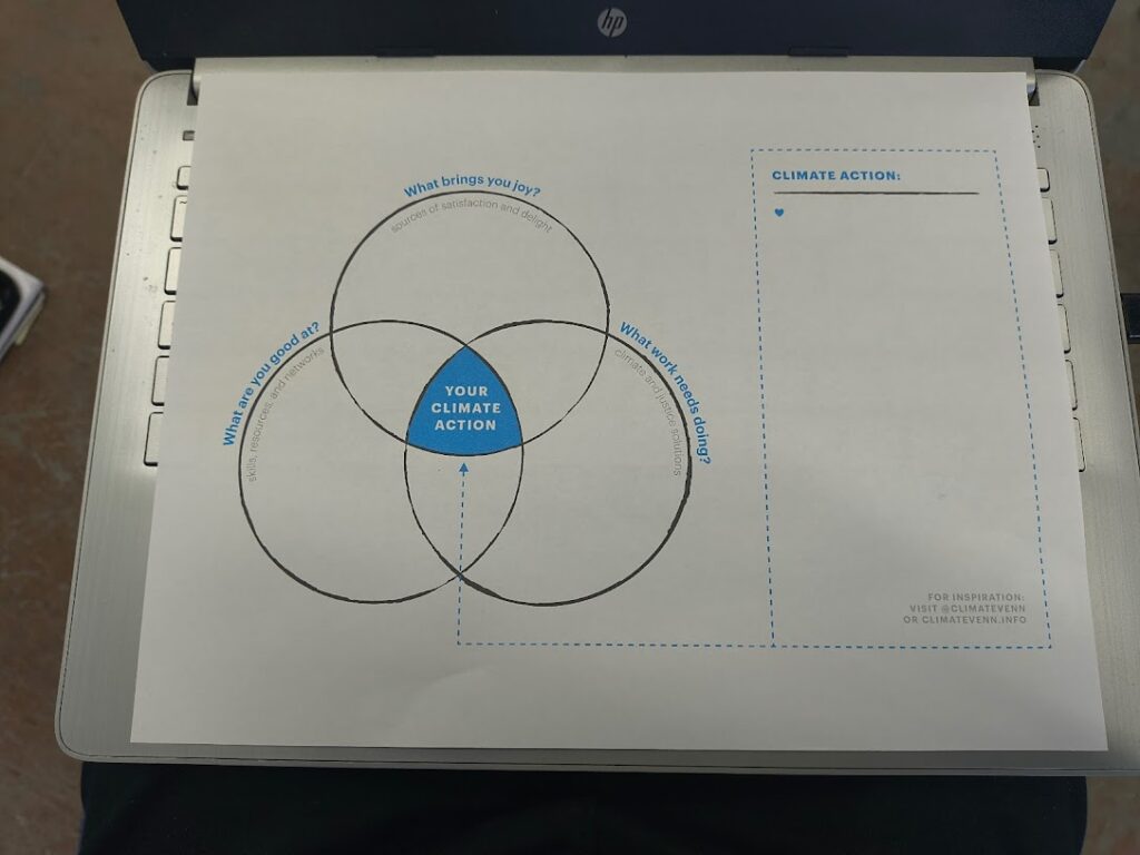 Afterwards, Devins led the attendees in creating a Personal Action Plan by using Dr. Ayana Elizabeth Johnson’s Climate Action Venn Diagram. It involves three different areas to think about: what brings you joy, what you’re good at, and what work needs doing?